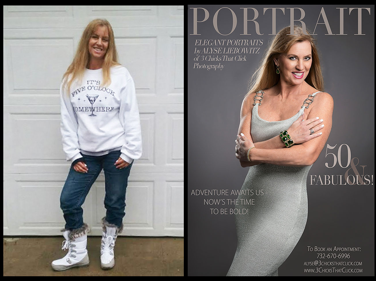 Dawn's casual look was transformed for her glamorous photo session, highlighting 3 Chicks's campaign of "50 & Fabulous"! We'll create your fabulous look with professional hair/makeup, gorgeous lighting and amazing wardrobe!